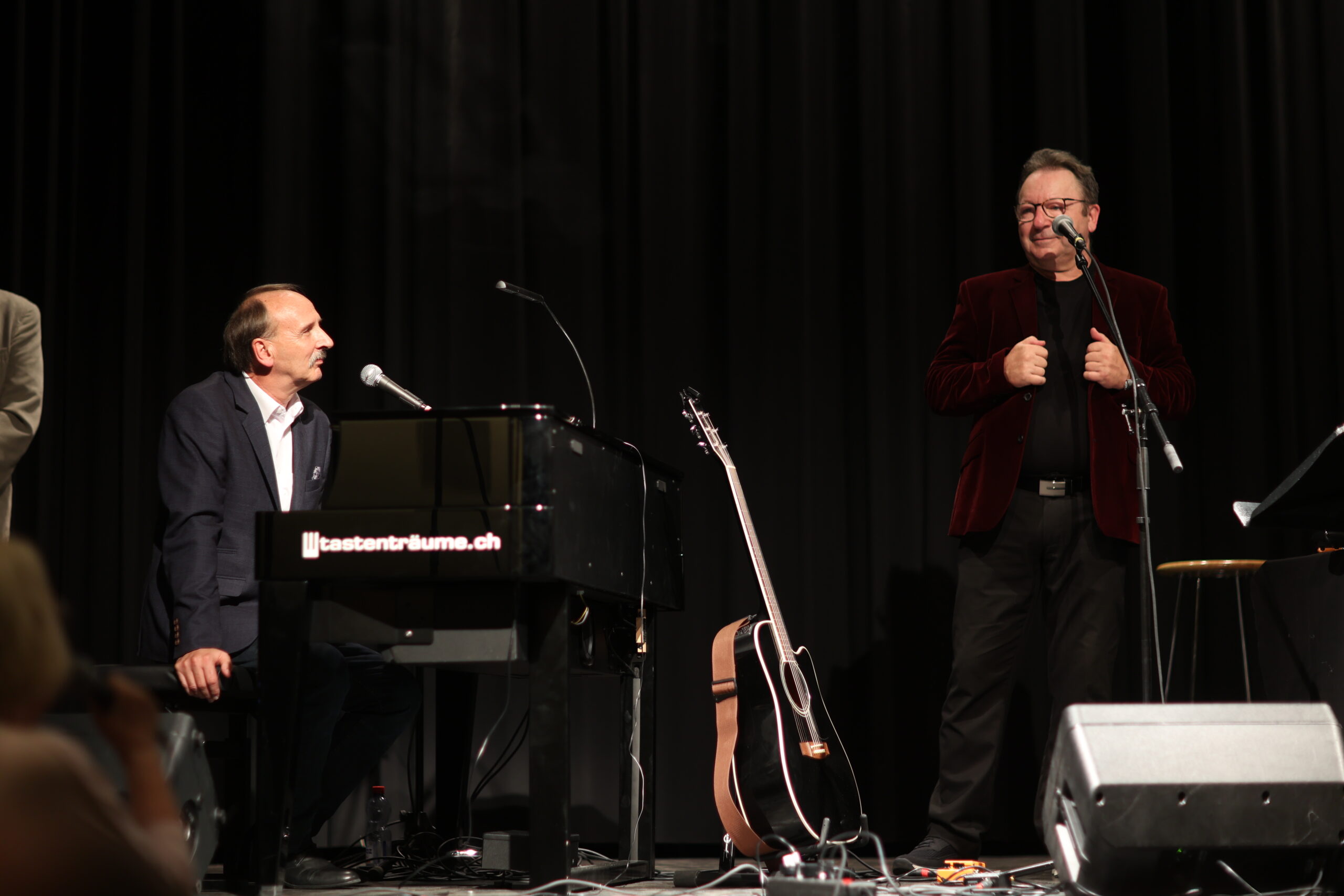 Gdy się jest na scenie od ponad 40 lat, to trzeba to uczcić. Jubileuszowy recital Zbigniewa Zamachowskiego od kilku lat cieszy się niesłabnącą popularnością. Jak się żenić, to się żenić, a jak czcić, to czcić – i w ten właśnie sposób na scenie w Brugg Zbigniew Zamachowski wystąpił ze swoim jubileuszowym recitalem po raz 240. Wyjątkowa, wysmakowana, dowcipna podróż sentymentalna przez cztery sceniczne dekady, wypełniona znakomitymi tekstami w mistrzowskiej interpretacji. Wciąż dokładnie nie wiadomo, czym jest piosenka aktorska i czy w ogóle należy ją uznać za gatunek sam w sobie. Różni teoretycy teatru i muzyki strzępili na ten temat pióra i klawiatury, a piosenka aktorska ciągle umyka definicjom. Piosenka może być ładna, brzydka, górska, morska / jak ją aktor śpiewa, musi być aktorska – śpiewał z tej sceny kilka lat temu Krzysztof Tyniec. Najprościej rzecz widział Wojciech Młynarski – piosenka aktorska jest wtedy, kiedy aktor gra, że śpiewa. Na scenie w Brugg Zbigniew Zamachowski grał, że śpiewał, grał, że tańczył, grał, że grał – i robił to wszystko z ogromnym wdziękiem, pasją i zacięciem. Od ponad 10 lat towarzyszy mu na scenie Roman Hudaszek - pianista, aranżer, kompozytor, kabareciarz, który wcześniej pracował ze Zbigniewem Wodeckim, Ireną Jarocką, Jackiem Cyganem, Bogusławem Mecem. Od pierwszych dźwięków słychać, że obaj panowie od lat razem grają, że grają i że sprawia im to ogromną przyjemność.