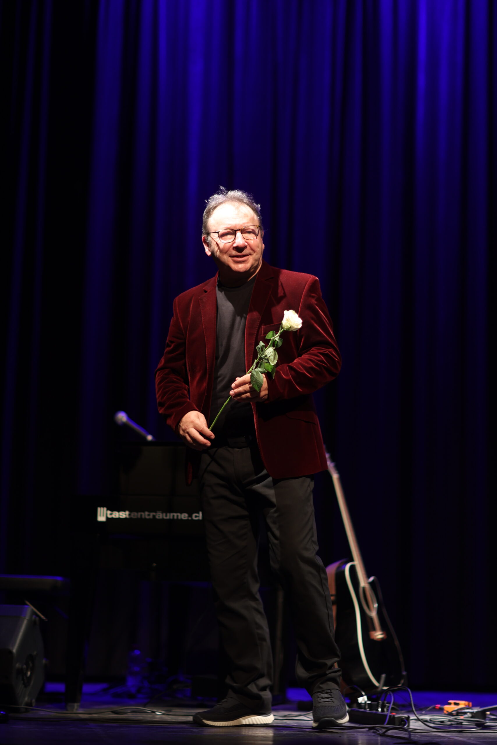 Jest jednakowo perfekcyjny niezależnie od tego, czy na scenie towarzyszy mu pełen skład muzyków, kwartet smyczkowy czy samotny pianista. Równie chętnie i z ogromnym wdziękiem akompaniuje sobie sam – gra (lub gra, że gra) na czym popadnie i co mu pod rękę podejdzie: w równym rządku czekają na swoja kolej cymbałki, prosty drewniany flet, okaryna, trójkąt, grzechotki. W uroczy sposób przerabia swoje braki w atuty – gdyby był wyższy, nie zagrałby Wołodyjowskiego. Chwytów na gitarę zna zaledwie kilka, ale przyznaje, że lubi na niej grać, bo dzięki swej kamuflującej formie ma korzystny wpływ na ogląd sylwetki. Z Romanem Hudaszkiem stanowią doskonały duet – cały recital jest rozmową starych dobrych przyjaciół, którzy rozumieją się w pół słowa i rewelacyjnie się uzupełniają. Wplata opowieści o Brzezinach, skąd pochodzi, o Łodzi, gdzie studiował i o Warszawie – bo choć warszawiakiem czuje się napływowym, to walca Bal na Gnojnej śpiewa jak najprawdziwszy chłopak z Czerniakowa.